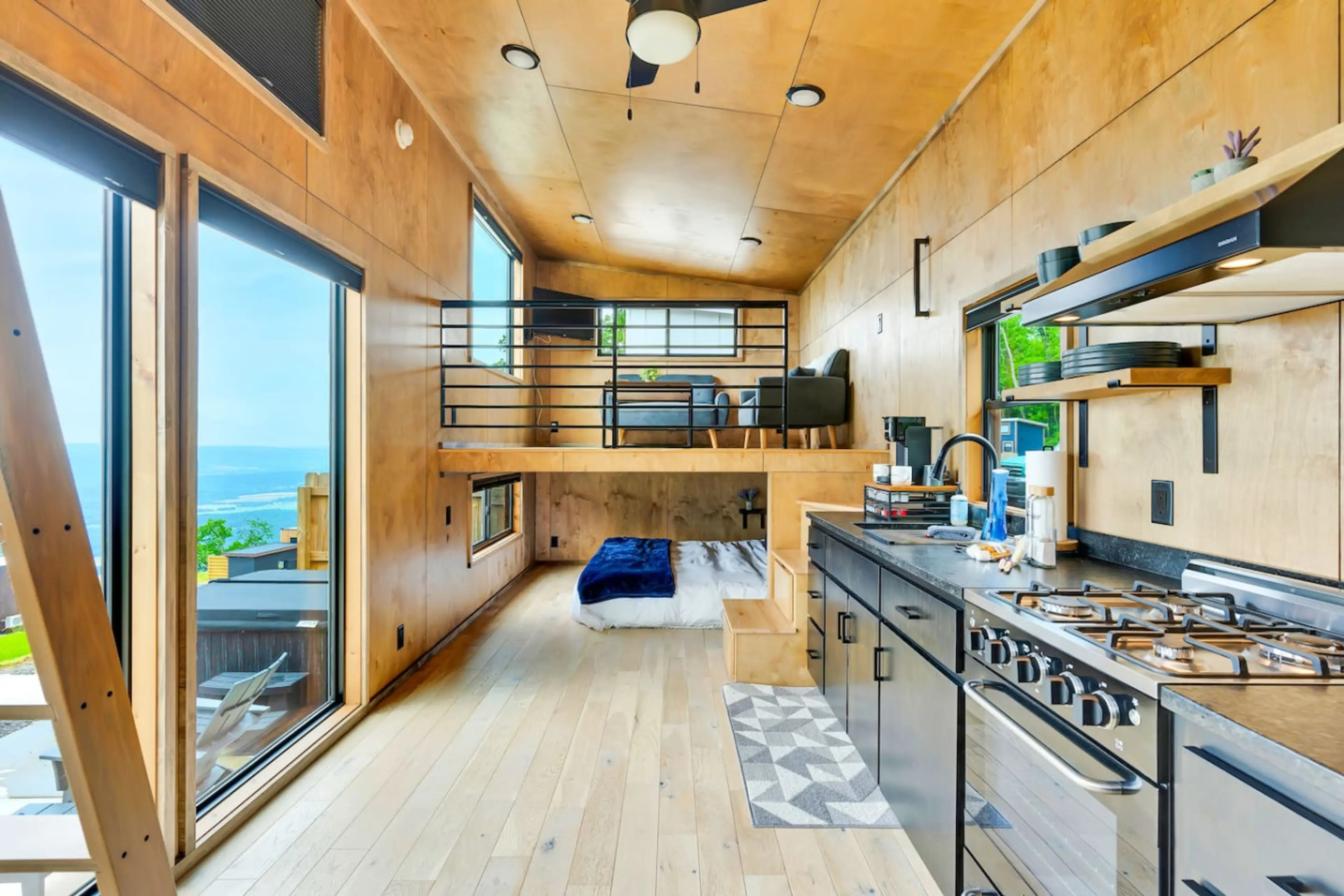 Tennessee Wall tiny home is spacious, open, and well equipped to make your stay at Mountain’s Ledge. This tiny home is one of our larger homes and comfortably hosts 4 people. The large windows in this 312sq ft tiny home gives and open and bright feel and everywhere you look there's an inspiring view...